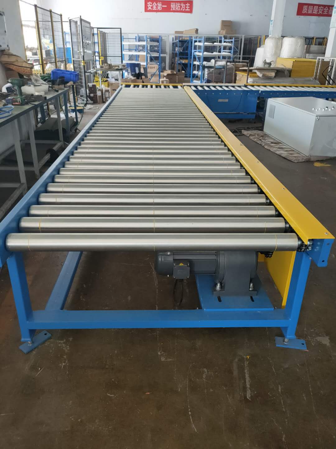 優(yōu)耐德科技根據(jù)客戶輸送貨物的尺寸、重量和對輸送速度的要求,為客戶定制了合適長度、合適寬度和合適高度的動力輥筒輸送機(jī)。動力輥筒輸送機(jī)支腿采用了碳鋼材質(zhì),表面噴塑處理,顏色采用了藍(lán)色,邊框也采用了碳鋼噴塑,而顏色采用了黃色,外觀美觀。
